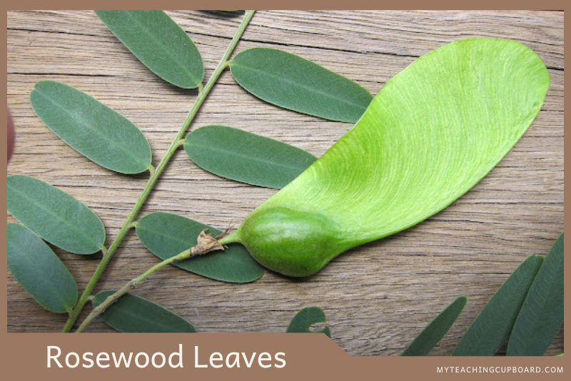 Natural Loose Parts: wood cookies, bamboo pieces, helicopter leaves (winged leaves like those on the Rosewood tree), pinecones, acorns, round pebbles,
