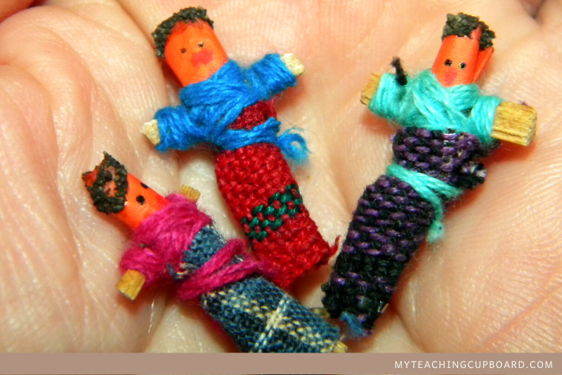 12. Here’s another wrapping activity for the rotation play schema. Make worry dolls by winding yarn around sticks or wooden pegs. Worry dolls are a Guatemalan tradition. Children tell their worries to their dolls and place them under their pillows when they go to bed that night. The tradition has the worry doll taking the child’s worries away while they sleep.